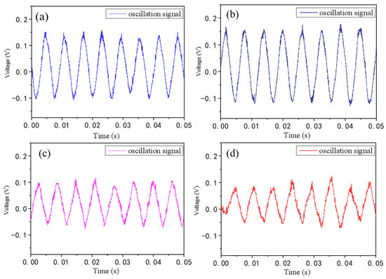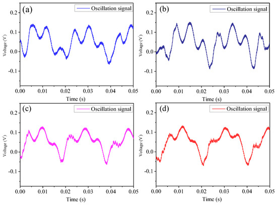 To accurately evaluate the impact of equivalence ratio settings on the ethanol atomization–combustion dynamics, the time-series signal from high-frequency dynamic pressure sensors was collected and analyzed. In Figure 6, four flame equivalence ratios were selected, φ = 0.45 in Figure 6a, φ = 0.60 in Figure 6b, φ = 0.75 in Figure 6c, and φ = 0.90 in Figure 6d. These working conditions correspond to the oscillation frequency in Figure 5. This study directly used the voltage signal of pressure sensors to analyze the characteristics of sound pressure oscillation and captured a 0.05 s time series of voltage signals. Compared to the results in Figure 6a with Figure 6d, the oscillation amplitude and frequency are higher at extremely low equivalence ratios than when the equivalence ratio is close to 1.0. From Figure 6, it can also be seen that at low equivalence ratios, the electrical signal of sound pressure oscillation is relatively regular, close to the sine waveform. However, at high equivalence ratios, the electrical signal of sound pressure oscillation fluctuates and becomes no longer regular. This is also consistent with the evolution law of the oscillation frequency mode transition presented in Figure 5. Ethanol flame dynamics and combustion instability are mainly induced by equivalence ratio variation, and these combined effects cause changes in the wavelength and oscillation period of sound waves, finally resulting in changes in the oscillation frequency. At the same time, as the air volume changes, the instantaneous flow field becomes more complex under combustion instability conditions [32], which will cause the evolution of the vortex-shedding process that greatly affects the flow field in the combustion chamber.
