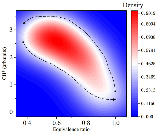 The fluctuation of the flame heat release rate is the source of combustion oscillation excitation. Therefore, to explore the dynamic characteristics of ethanol atomization–combustion, Figure 7, Figure 8 and Figure 9 studied the amplitude, frequency, and time-series signal variation characteristics of flame heat release rate fluctuation. Figure 7a shows the distribution density of the flame heat release rate in the combustion chamber, while the equivalence ratio varies from 0.40 to 1.0. While the equivalence ratio increases or decreases, the flame heat release rate and combustion chamber sound pressure signal are synchronously collected. To present the intensity distribution of flame heat release rate more accurately, the flame equivalence ratio increases or decreases by 0.1 each time. It can be inferred from Figure 7 that the flame heat release rate gradually decreases as the flame equivalence ratio φ increases from 0.40 to 1.0. This is different from the sound pressure amplitude in Figure 3. The fluctuation intensity of the flame heat release rate gradually decreases and eventually slows down as the equivalence ratio φ increases. However, the flame heat release rate gradually increases as the flame equivalence ratio φ decreases from 1.0 to 0.55. This is consistent with the maximum sound pressure amplitude in Figure 3. The fluctuation intensity of the flame heat release rate gradually decreases as the equivalence ratio φ decreases from 0.55 to 0.40. The intensity of the flame heat release rate drops from 2.6 arb.units to 0.6 arb.units as the equivalence ratio rises from 0.4 to 1.0, and the flame heat release rate rises from 0.6 arb.units to 3.8 arb.units as the equivalence ratio drops from 1.0 to 0.55, then continues to decrease from 3.8 to 2.7 as φ drops to 0.40.