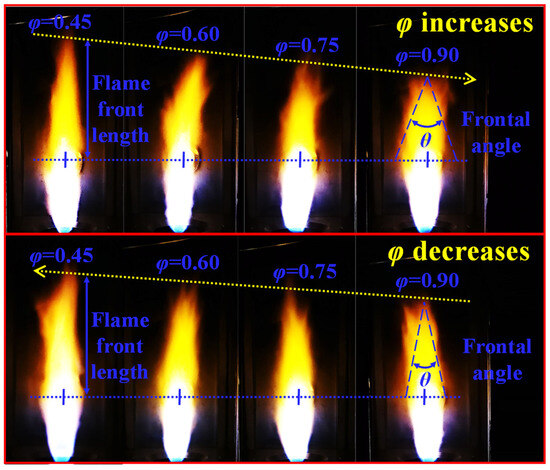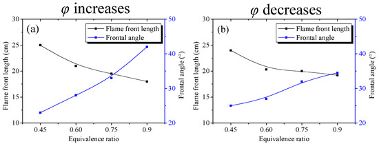 Detailed value of the front length and frontal angles for the ethanol flame in this study. Four equivalence ratios were selected and compared. (a) The equivalence ratio increases. (b) The equivalence ratio decreases.