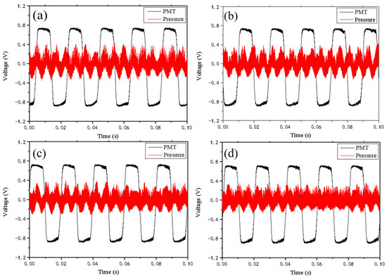 Effects of different flame equivalence ratios on the time-series signal of sound pressure signal in the atomized air delivery pipeline. φ = 0.45 in (a), φ = 0.60 in (b), φ = 0.75 in (c), and φ = 0.90 in (d).