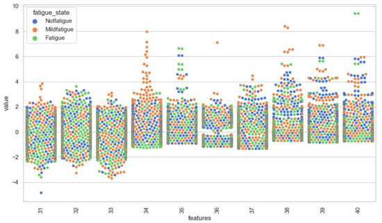 In Figure 1, blue, yellow, and green, respectively, represent the distribution of voice feature values when “Notfatigue”, “Mildfatigue”, and “Fatigue” are present, and we can see that the voice features of the three fatigue states are intertwined with each other, so the classification of fatigue speech is difficult.