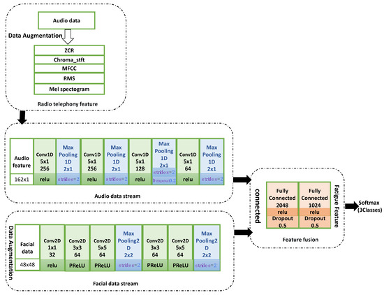The processing results for the audio and facial data streams are fused in the fully connected layer, and, finally, the fused features are input into the Softmax classifier for classifying three fatigue states.