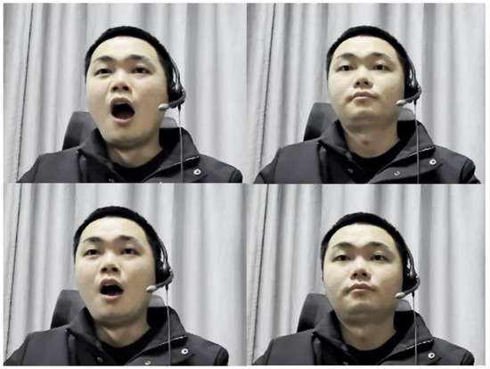 The experiments were conducted at 14:00 every day from 4 April to 27 April 2023. During this period, one controller was assigned to conduct experiments in the control seat every day. During each experimental day, we asked the subjects to complete six sets of control simulation tasks, each set of which had a volume of 20 flights and lasted for 30 min, and with radio telephony and facial data only recorded while they were in the control seat during the experiments. After each set of tasks had been completed, we allowed the subjects to rest for 5 min and complete the 9-point Karolinska Sleepiness Scale during this rest period to assess their fatigue status as a score from 1 to 9 [31]. The result was used to categorize the controller’s fatigue status as no fatigue, mild fatigue, or severe fatigue [32]. At the beginning of the experiment, the scale assessment results showed that the subjects were mostly in a no-fatigue state. After the experiment had been conducted for a while, the assessment results of some scales showed that the subjects appeared to be fatigued. The typical fatigue features are shown in Figure 4.