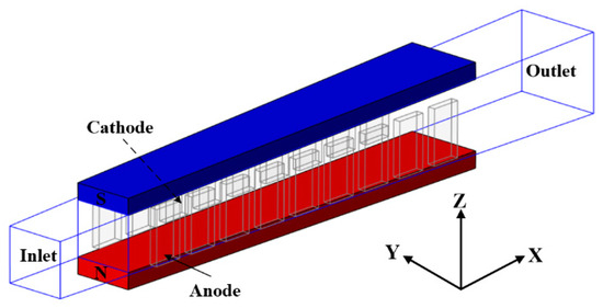 The channel structure utilized in this study is illustrated in Figure 1. The entrance size of the channel is mm, the exit size is mm, the total length is 500 mm, and the expansion angle of the channel is 1°. There are a total of 20 pairs of electrodes, with a width of 10 mm and a spacing of 5 mm between each pair. The initial pair of electrodes is positioned 25 mm away from the entrance.