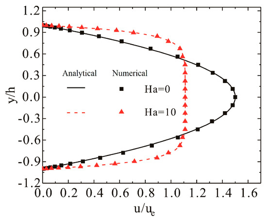Hartmann flow is a fundamental flow with an analytical solution in magnetohydrodynamics, providing a robust representation of the influence of the Lorentz force on flow. Consequently, the Hartmann flow was employed for validation purposes to assess the computational capability of the model for conductive fluid [14]. The numerical solution demonstrated a high degree of consistency with the analytical solution, thereby confirming the effectiveness of the model, as shown in Figure 2. Furthermore, program verification was also conducted with experiments in previous work [22]. The maximum error in speed is 7.87%, potentially attributed to the simplification of conductivity and neglecting the influence of the Hall effect. However, it effectively captures the velocity trend, affirming the feasibility of this algorithm.