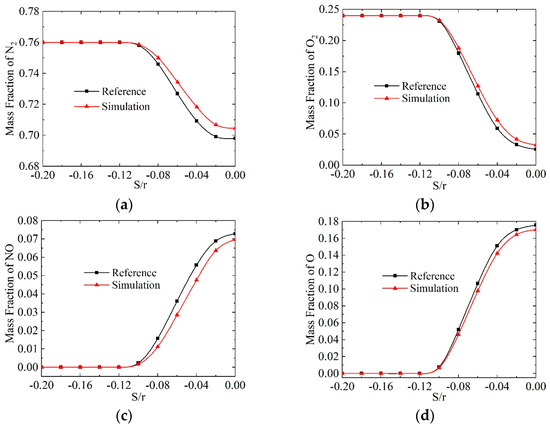 The mass fractions of N2, O2, NO, and O along the stagnation line. (a) Mass fraction of N2. (b) Mass fraction of O2. (c) Mass fraction of NO. (d) Mass fraction of O.