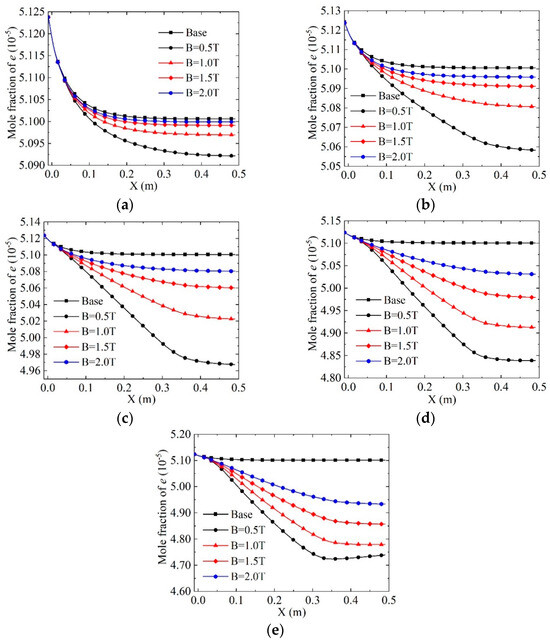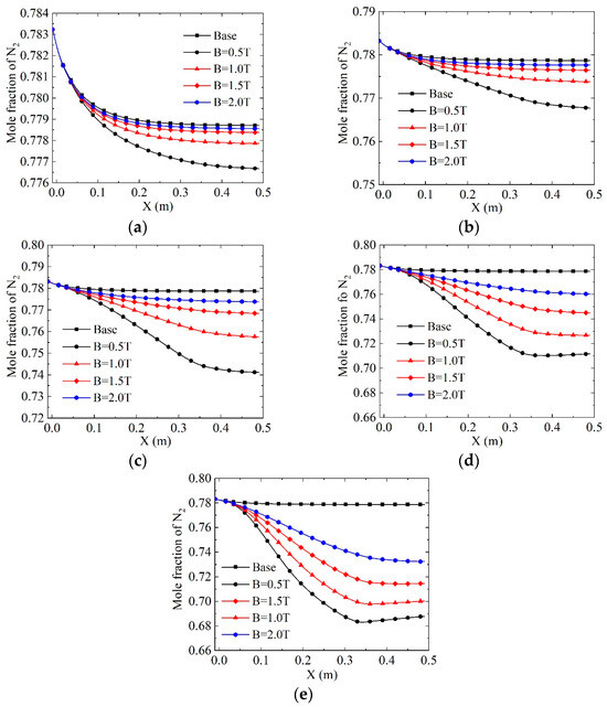 The mole fraction of N2 along the center axis under different magnetic field intensities and external potentials is illustrated in Figure 4. When the applied potential is between 200 V and 600 V, the mole fraction of N2 gradually increases with the increase in magnetic field intensity but remains smaller than in the case of no electromagnetic effect (base). This is attributed to the influence of energy injection, where the rising temperature and intensification of chemical reactions lead to increased N2 decomposition, subsequently reducing its mole fraction. When the applied potential is constant, the induced electromotive force grows with the increment of the magnetic field intensity. Correspondingly, the energy injection is inhibited, resulting in decreased N2 decomposition and an increase in mole fraction. It is evident that the higher the applied potential, the higher the decomposition rate of N2, and the applied potential plays a more significant role than the magnetic field in terms of the rate of the chemical reaction. Additionally, Figure 4e reveals that when U = 600 V and B = 0.5 T, the mole fraction of N2 increases in the latter half of the channel. This is because the reaction is reversible; once the amount of N2 is too low, the reverse reaction rate of N2 becomes higher than the forward reaction rate, leading to an increase in the content of N2.