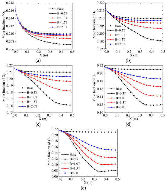 The variation of the O2 mole fraction is very similar to that of N2, positively related to magnetic field intensity and negatively correlated with applied potential, as shown in Figure 5. However, since the dissociation temperature of O2 is lower, the dissociation degree of O2 is much higher than that of N2 under the same conditions. With the magnetic field at 0.5 T and the potential at 200 V, the dissociation degrees of O2 and N2 at the exit of the channel are 4.25% and 0.830%, respectively. With the magnetic field at 0.5 T and the potential at 600 V, the dissociation degrees of O2 and N2 are 62.5% and 12.2%, respectively. Obviously, the difference in dissociation degree between the two also increases with the increase of the applied potential.