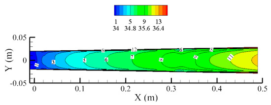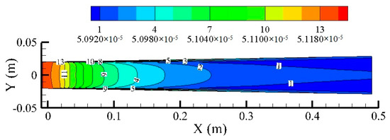 Figure 9 displays the conductivity distribution in the XOY plane when B = 1.5 T and U = 300 V. In the core flow area, conductivity changes smoothly and symmetrically, consistent with the trend in Figure 8. At the same value of X, there is higher conductivity near the wall in the electromagnetic region due to low temperature, while the trend in the second half of the channel is the opposite.