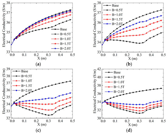 Upon the application of an electromagnetic field, as observed in Figure 7 and Figure 8, the electron number density further decreases, and the particle collision frequency rises due to the injected energy. Consequently, the gas’s electrical conductivity remains smaller than that without electromagnetic action. When the applied potential is constant, higher magnetic field intensity leads to larger electrical conductivity, revealing the opposite tendency when the magnetic field intensity is constant. In the second half of the channel (X > 0.31 m), conductivity exhibits a significant upward trend. This is because, after the gas exits the electromagnetic action region, the influence of Joule heat continues to diminish with the drop in particle collision frequency, causing a slight increase in electrical conductivity.