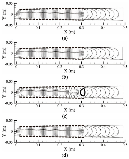 Figure 10 depicts the distribution of current lines in the XOY plane under different magnetic field intensities and applied potentials. With the exception of Figure 10c, the other plots exhibit a similar trend. The current overflows at the front and back of the electromagnetic action region due to the conductivity of the working fluid throughout the channel, correctly flowing from the cathode to the anode. The overflow currents ultimately concentrate on the first and last pairs of electrodes, following the conductive wall condition of the cathode and anode and the insulation wall condition of the rest of the walls.