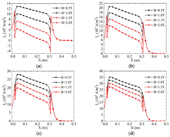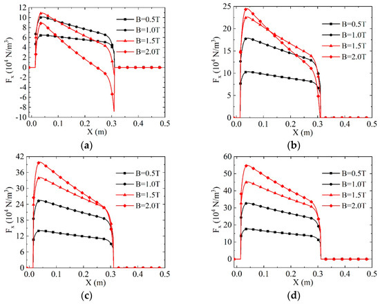 The Lorentz force in the X direction is not only influenced by the current density but is also closely related to the magnetic field strength, as illustrated in Figure 12. The direction of is solely determined by since the magnetic fields used in this work are all uniform magnetic fields pointing in the positive direction of the Z-axis. When the current flows from the cathode to the anode (), the Lorentz force points in the positive direction of the X-axis, representing positive work. Examining Figure 12, it is evident that when the applied potential is small, decreases and may even assume negative values with the increase in the magnetic field strength, resulting in the intersection of in the diagram. Conversely, when the applied electric potential is large, the basic value of current density is strong and exhibits a certain regularity of increase with the rise in magnetic field strength.