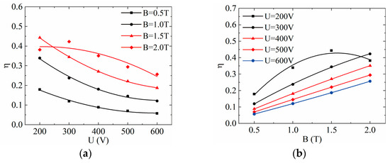 Figure 13 illustrates the electrical efficiency under different applied potentials and magnetic field strengths. When the magnetic field strength is held constant, the channel’s electrical efficiency gradually decreases with the increase of the applied potential, as depicted in Figure 13a. The downward trend is nonlinear, and the decreasing rate diminishes as the potential rises. Notably, there is an observable phenomenon of energy extraction () at B = 2.0 T and U = 200 V. This explains why the electrical efficiency is lower than that at B = 2.0 T and U = 300 V. For applied potentials exceeding 300 V, the electrical efficiency exhibits nearly linear growth with the increase in the magnetic field intensity, as shown in Figure 13b. The variation trend of electrical efficiency is closely linked to conductivity. As the magnetic field intensity increases, the conductivity and the energy utilization rate of the channel also increase, leading to the growth of electrical efficiency. Additionally, the linear growth rate decreases with the increase of the applied potential.