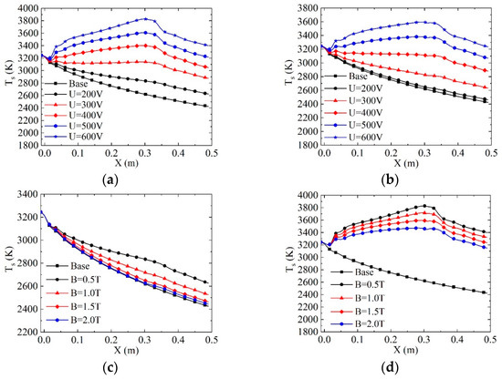 The static temperature along the center line under different conditions is depicted in Figure 14. When the magnetic field intensity is constant, Joule dissipation becomes more intense with the increase of the applied potential, leading to an increment in channel static temperature. Conversely, when the applied potential is constant, the current density decreases with the increase in magnetic field strength, suppressing the Joule heating effect and causing a decrease in static temperature. In conjunction with Figure 8, it is evident that the Joule heating effect is weak when the applied potential is small, resulting in increased gas conductivity along the flow direction. Consequently, a significant portion of the gas’s internal energy is converted into kinetic energy, leading to a monotonous decrease in static temperature along the X direction after passing through the first pair of electrodes, as shown in Figure 14c. In contrast, the Joule heating effect is more pronounced at a larger applied potential, causing the static temperature to continuously increase in the electromagnetic action region, as shown in Figure 14d.