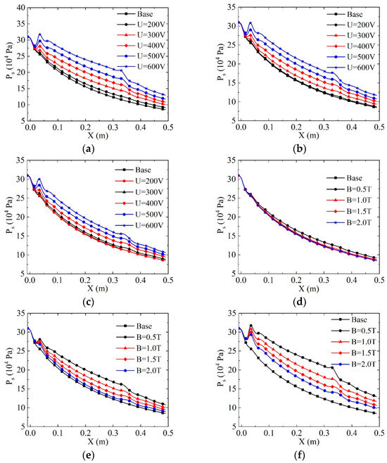 Figure 15 illustrates the distribution of static pressure along the center line of the channel. Following the application of the electromagnetic field, there is a significant increase in static pressure near the first pair of electrodes, indicating an MHD compression effect. When the magnetic field intensity is held constant, the static pressure rises with an increase in the applied potential. Conversely, when the applied potential is constant, an increase in magnetic field intensity helps alleviate the impact of the Joule heating effect, resulting in a decrease in static pressure. Additionally, in cases of low applied potential and high magnetic field strength, the static pressure curve closely resembles that without electromagnetic effect, as depicted in Figure 15c,d.