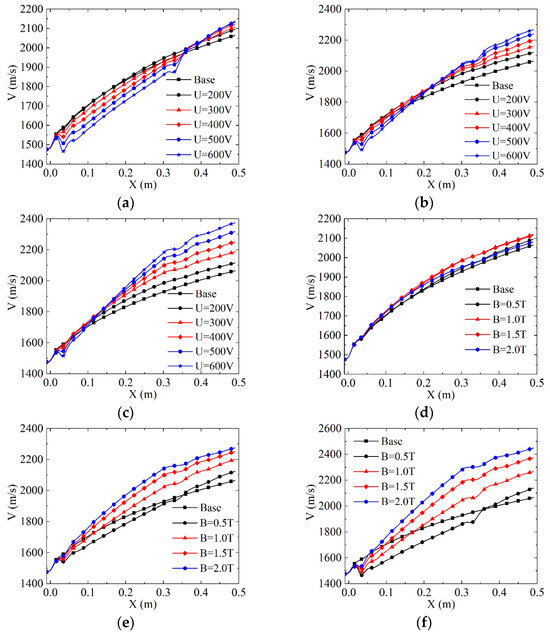 Figure 16 depicts the distribution of velocity along the center line of the channel. Under the influence of the MHD compression effect, the velocity decreases near the first pair of electrodes. This phenomenon becomes more pronounced with an increase in applied potential and a decrease in magnetic field intensity. Consequently, the gas must traverse a certain channel length, denoted as D, before achieving acceleration comparable to that without electromagnetic effect. When the magnetic field intensity is small, the value of D may exceed the entire electromagnetic region, as shown in Figure 16a. As the magnetic field intensity increases, the channel length gradually shortens, as demonstrated in Figure 16b,c, with maximum values of approximately 0.18 m and 0.1 m, respectively. When the magnetic field intensity is constant, an increase in applied potential also augments the value of D. However, the impact of external potential is considerably smaller than that of the magnetic field, particularly in cases of low magnetic field intensity. Combined with Figure 12, it becomes evident that when the applied potential is small, the Lorentz force performs negative work in the electromagnetic region with an increase in magnetic field intensity, leading to a decrease in velocity. Hence, the maximum exit velocity is observed at B = 1.0 T, while the velocity at B = 1.5 T falls between that at B = 1.0 T and B = 2.0 T in Figure 16d. With the magnetic field set at 2.0 T and the potential at 200 V, the exit velocity is 2081 m/s, representing only a 0.873% increase compared to that without electromagnetic effect. With the magnetic field at 2.0 T and the potential at 600 V, the exit velocity is 2448 m/s, which is 18.6% higher than that without electromagnetic effect.