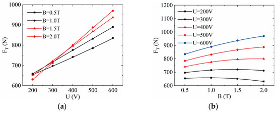 The channel thrust under different applied potentials and magnetic field intensities is depicted in Figure 17. When the magnetic field intensity is constant, the velocity and pressure at the outlet increase with the rise of applied potential, resulting in enhanced thrust, as illustrated in Figure 17a. However, with constant applied potential, the channel thrust may decrease as the magnetic field strength increases, as shown in Figure 17b. This phenomenon is attributed to the strong magnetic field conditions, where the Lorentz force may perform negative work in the channel, leading to a reduction in electromagnetic power and velocity. Concurrently, the static pressure also decreases, contributing to a decline in thrust.
