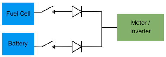 The combination of a battery and a fuel cell in a hybrid provides a propulsion system that delivers high power when the demand peaks, while taking advantage of the high specific energy of hydrogen during phases with a lower demand. In a direct-hybrid, the fuel cell and the battery are connected to a powertrain, as shown schematically in Figure 1, without the use of a DC/DC converter. Diodes are installed to prevent the current from flowing backwards into the fuel cell or the battery. If a charging function of the battery is to be included in the system, the diode in the battery path has to be bypassed or eliminated.
