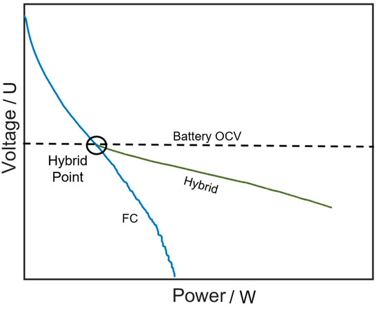 At low power levels, only the fuel cell supplies power. As power demand increases, the fuel cell voltage decreases in the hybrid system until it reaches the OCV of the battery. At this point, referred to as the hybrid point, the battery begins to deliver power as well. At higher power levels (to the right side of the hybrid point in Figure 2), both the fuel cell and the battery supply power, resulting in a less pronounced gradient of the characteristic curve compared to a fuel-cell-only curve as well as a higher power output. Connecting the battery to the system stabilizes the voltage level, which leads to a higher system voltage level at the same power due to the voltage of the battery [29].