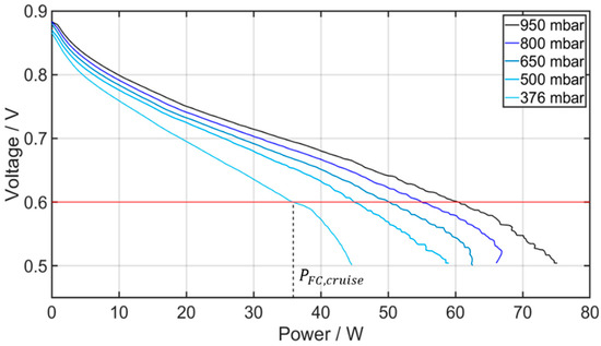 Figure 3 shows the voltage over power curves for one single fuel cell at different operating pressures (based on the HD10 stack) [36]. The pressures shown correspond to altitudes between ground level (950 mbar) and 25,000 ft (376 mbar). The figure shows the expected decrease in power with lower pressure. For a fuel cell, a minimum operating voltage is usually defined to prevent excessive aging. For the following considerations a minimum cell voltage of 0.6 V is assumed. This is marked as a red line in Figure 3. According to the international standard atmosphere, the ambient temperature decreases as well at high altitude [30]. For the presented considerations, it is assumed that with respect to temperature and humidity, the air is preconditioned before it enters the fuel cell and the influence of temperature and humidity is therefore not considered.