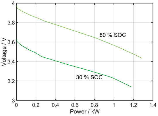 Since in a direct-hybrid there is no DC/DC to adapt the voltage levels of the fuel cell and battery, the voltage levels of these two components must match in any load scenario. The voltage of a battery changes strongly with the state of charge (SOC) and the discharge rate, as can be seen in Figure 4 which shows the voltage of a lithium-ion battery cell plotted against the cell power for two different SOC levels (30% and 80%). The data in Figure 4 are based on previously published data of a single battery cell (type SLPB120255255, 75 Ah pouch, Kokam Co., Ltd., Suwon, Republic of Korea) [29]. It can be seen that a lower state of charge leads to a lower voltage and to a reduced maximum power.