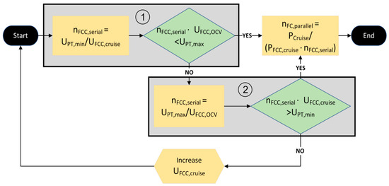 However, if the maximum voltage of the fuel cell exceeds the maximum powertrain voltage , the number of serial cells has to be modified and recalculated taking the upper voltage limit into account. In this case, the process follows the path from block 1 into block 2 in Figure 6. In block 2, a new number of single fuel cell cells in series is calculated using Equation (2), but instead of the minimum powertrain voltage the maximum powertrain voltage is used.