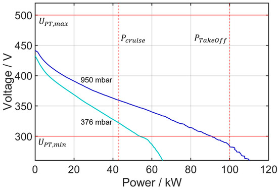 It can be seen in Figure 7 that the voltage–power curves of the fuel cell system do not exceed the voltage limits of the powertrain at cruise power, confirming the correctness of the calculated number of fuel cells in series. Considering the characteristic fuel cell curve at 376 mbar, it can be seen that the fuel cell will deliver 53 kW when , is reached. This is more than the required 43 kW for cruise as defined in Figure 5. However, looking at the curve for ground level at a pressure of 950 mbar, the fuel cell can only deliver 90 kW until , is reached, which is less than the desired 100 kW take-off power defined by the mission profile. Therefore, hybridization with a battery is required.