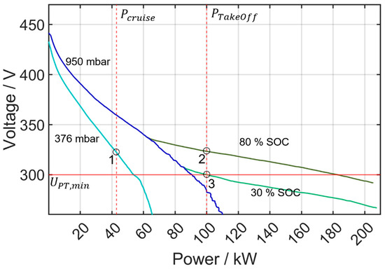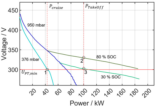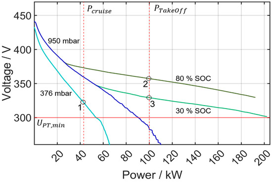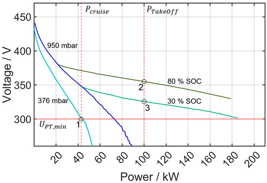 When the fuel cell was designed as described in the corresponding section above, the ideal parallel scaling of the fuel cell was found to be 2.42. A scaling like this requires a new fuel cell design, for example, with a different active area or different cell power density. Changing the cell area of a fuel cell stack makes a new stack design necessary. For the following considerations it is assumed that a redesign of the cell area and therefore a parallel scaling of the fuel cell of 2.42 is possible. This corresponds to a reduction in the cell area of 19% and the power–voltage characteristics were adapted accordingly. The resulting hybrid curves for a system with the scaled and optimized fuel cell configuration are shown in Figure 10. Here, the fuel cell curves at 950 mbar and 376 mbar are plotted (blue), as well as the hybrid curves at 950 mbar, 80% and 30% (green). The operation points for cruise and take-off power as well as the minimum allowed system voltage are marked as well.