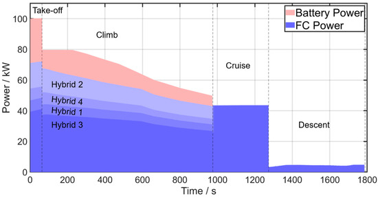 A direct-hybrid system, based on the operational data of a PEM fuel cell (type HD10, Cummins Inc., Columbus, IN, USA) and a lithium-ion battery (type SLPB120255255, 75 Ah pouch, Kokam Co., Ltd., Suwon, Republic of Korea), was designed and optimized to fit the power demand of a realistic flight mission power profile. The power profile was based on the shaft power of a 40-seater aircraft of the Do328 class, which was scaled down to 100 kW.