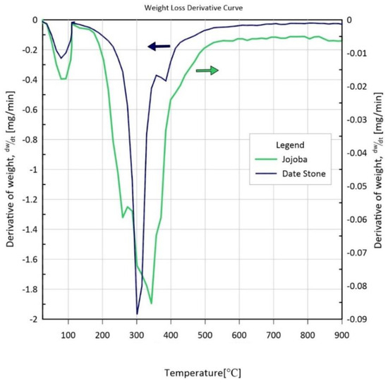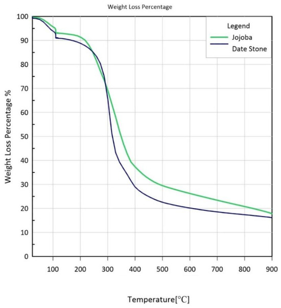 Proximity analysis was conducted to calculate the amounts of moisture (M), volatile matter (VM), fixed carbon (FC), and ash based on the weight loss percentage plot in Figure 3. Table 5 shows the comparison between these findings with those from the literature. Compared to date stone, jojoba had lower moisture, volatile matter, and fixed carbon contents than date stone. In terms of ash after burning, jojoba had ash levels that were above 20%, while date stone had 6.4%. The test results reveal that date stone biomass contains higher levels of moisture, fixed carbon, and ash with a lower level of volatile matter.