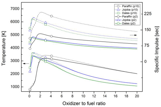 Performance estimation with respect to oxidizer-to-fuel ratio, for combustion temperature and specific impulse performance of date, jojoba, and paraffin, in different chamber pressure conditions of 2 bar and 10 bar (denoted as p2 and p10, respectively).