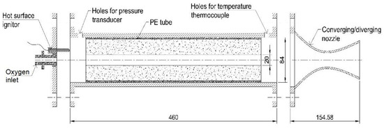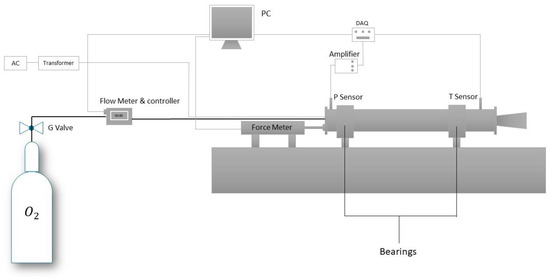 The lab-scale hybrid rocket test setup was composed of a lab-scale hybrid rocket, a gaseous oxygen feeding system, a hot surface ignitor, a K-type thermocouple and pressure transducer, an amplifier, a data acquisition (DAQ) system, a force measuring device, a gas flow meter, and a controller as the system’s primary components. For the thrust measurement during tests, a force meter was used to measure the rocket thrust by transferring the data to a PC. A K-type thermocouple was used to measure the temperature inside the combustion chamber and was placed 1.5 cm away from the nozzle. A piezoelectric pressure transducer was placed 3 cm away from the closing cover at the ignition side, sensing the pressure inside the combustion chamber, as illustrated in the schematic depiction in Figure 8.
