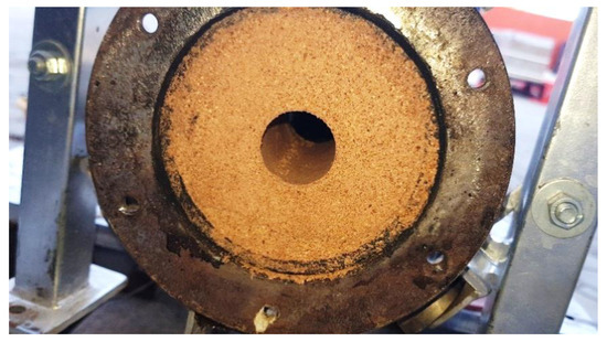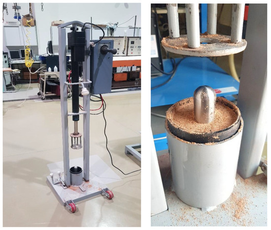 The biomass grains proposed cannot be inserted directly into the combustion chamber due to their weak mechanical structure. Therefore, a compression device was designed and manufactured to strengthen the substance structure to avoid any collapse that could lead to losing the standard shape of the grains with the circular port needed to perform the test. The compression device consisted of a base for the grain’s mold to be placed on, and a circular metal rod was inserted to make the grains a hollow shape. A piston of the machine was designed accordingly to press the grains around it with an automated arm using an electric actuator. The fuel was intended to be compressed tightly with the applied compression force until it became sufficiently solid to permit easy removal of the cylindrical rod. The manufactured device is shown in Figure 6. Having coherent grains with proper ports for the oxidizer flow helps to have a better understanding of the regression rate of the grains and the thrust generated. Biowaste fuel grain fabricated by the compression device is shown in Figure 7.