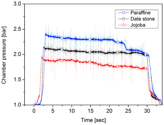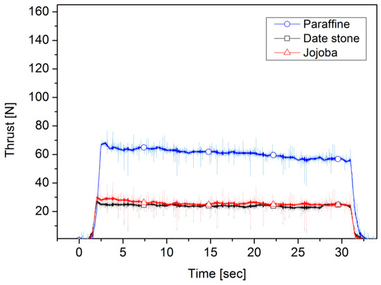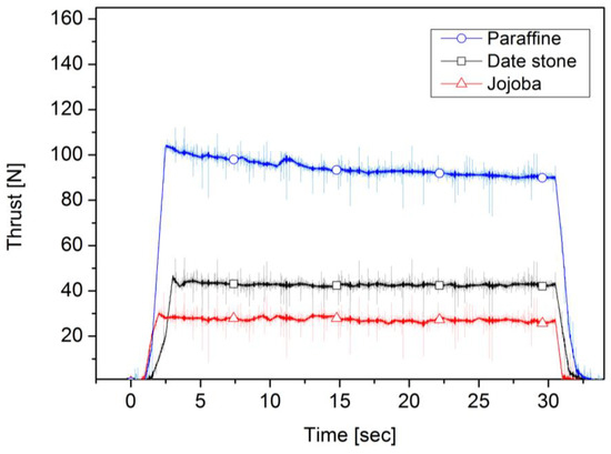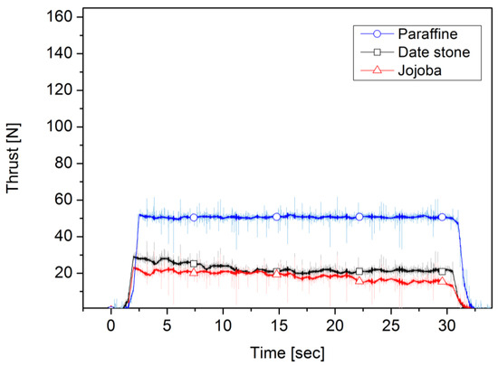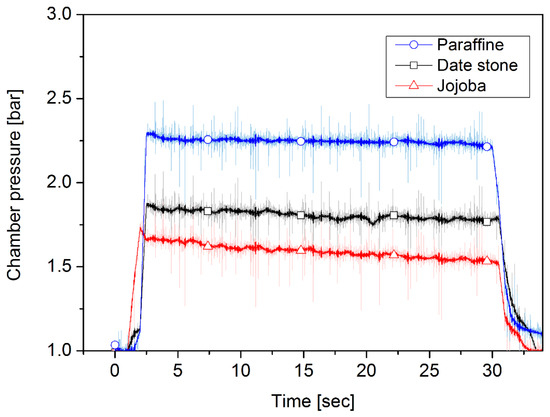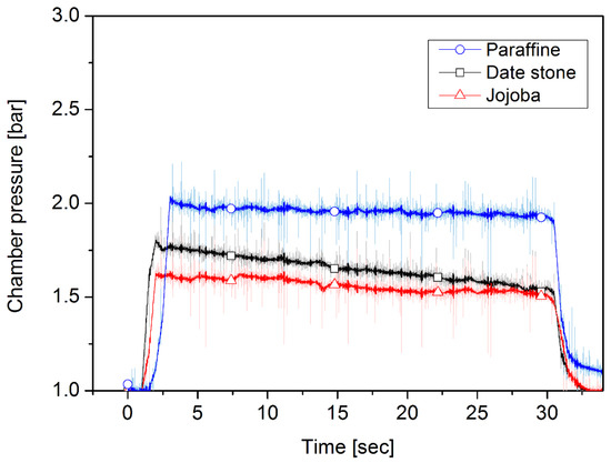 Figure 9, Figure 10, Figure 11, Figure 12, Figure 13 and Figure 14 present the recorded pressures built up in the chamber and the amount of thrust generated during 30 s of thruster operation. As shown in Figure 9 and Figure 10, in the case of 80 lpm, paraffin-wax-based fuel reached the highest chamber pressure among the fuels used, reaching approximately 2 bar. Combustion pressure for date stone first increased, reaching 1.8 bar, and then decreased until it reached approximately 1.5 bar after about 30 s of operation, while the thrust force increased to 23 N and then fluctuated around 22 N for 15 s. A notable fluctuation took place until the end of the firing. For jojoba fuel, the starting chamber pressure was approximately 1.6 bar, lower than that of date stone, and then it decreased gradually during the 30 s of the firing test, reaching approximately 1.5 bar, a similar end pressure to that of date stone. The average thrust was 22.07 N and 18.08 N for date stone and jojoba, respectively, the performance of which was lower than that of paraffin wax, which had an average amount of thrust produced of 49.44 N. In terms of chamber pressure as well, the biomass fuels reached a lower pressure than paraffin fuel, which reached approximately 2 bar. Pressure and thrust profiles for the oxidizer volume flow rate of 110 lpm case are shown in Figure 11 and Figure 12. For date stone, the amount of thrust increased to 27 N and the chamber pressure reached approximately 1.85 bar. There was a variation in the chamber pressure and the amount of thrust produced, but they ended with approximately 1.8 bar and 26 N, respectively, with better stability than in the case of the 80 lpm oxidizer flow rate. In the case of jojoba, similarly to the date stone fuel, there was an increase in pressure and the amount of thruster generated. The thrust increased to 33 N and the pressure reached 1.75 bar. Also, the thrust exhibited less fluctuation than that under the 80 lpm oxidizer flow rate. It was notable that the combustion pressure and thrust of jojoba showed slightly lower values compared to date stone propellant under the same oxidizer flow rate condition. Jojoba showed a similar fluctuation to date stone in terms of their thrust profile. However, the date stone thrust profile maintained the same average value until the end of the experiment, while the jojoba thrust had a considerable drop after 20 s of burning. With a 110 lpm oxygen volume flow rate, a higher pressure value, of 2.25 bar, was recorded for paraffin fuel, and it remained almost constant during the burning time. Meanwhile, the thrust profile started at 69 N and was followed by a fluctuating decline until the end of the run, with a consistent drop during the experiment until it reached 60 N. The combustion pressure had better stability at 2.3 bar during the burning time than that of the biowaste fuels.