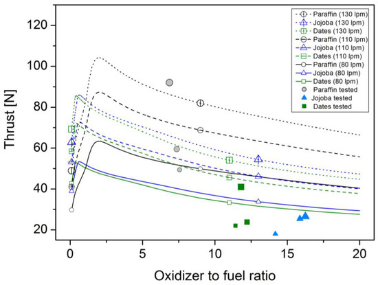 The O/F ratios for paraffin fuel were the lowest in comparison with other biomass fuels, and the O/F ratios for date stone were lower than those for jojoba. Paraffin fuel recorded an O/F ratio between 6.9 and 7.7, varying depending on the oxidizer flow rate, while jojoba recorded the highest value of 14.2–16.2, and date stone reached 11.4–12.2, lower than jojoba but higher than paraffin fuel. These experiment results are shown in Figure 15, where they are compared with expected thrust performance depending on oxidizer-to-fuel ratio and mass flow rate of oxidizer and fuel consumed during the test, while theoretical specific impulse performance in the case of 2 bar chamber pressure was considered. Similar to the figure, there are expected peak thrusts near 0.6, 0.4, and 1.9 O/F ratios for jojoba, date, and paraffin, respectively. The fuels were not tested with the oxidizer-to-fuel ratio near its optimum; in addition, the expected thrust performance varied depending on the oxidizer-to-fuel ratio, but there was still a discrepancy between expected theoretical thrust and experimental performance. The main cause of the difference stemmed from the difference of chamber pressure for the reference curve estimated under the assumption of 2 bar, while experimental data presented a chamber pressure sometimes higher or lower than 2 bar, although experimental data also showed an increasing thrust trend with respect to increasing oxidizer, and, thus, with total mass flow rate.