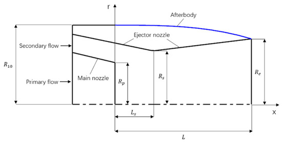 This study focuses on a symmetrical axisymmetric ejector nozzle integrated with the afterbody of an aircraft. It includes a convergent–divergent ejector sleeve added outside the converging main nozzle. The aircraft afterbody consists of a straight section and a converging section, connected to the exit of the ejector nozzle. Due to the symmetry of the structure about the nozzle axis, a two-dimensional model is employed for the study. Figure 1 provides a schematic diagram of the two-dimensional geometric model. In the ejector nozzle, the primary flow flows out through the convergent main nozzle and mixes with the secondary flow, and then flows out of the ejector nozzle together.