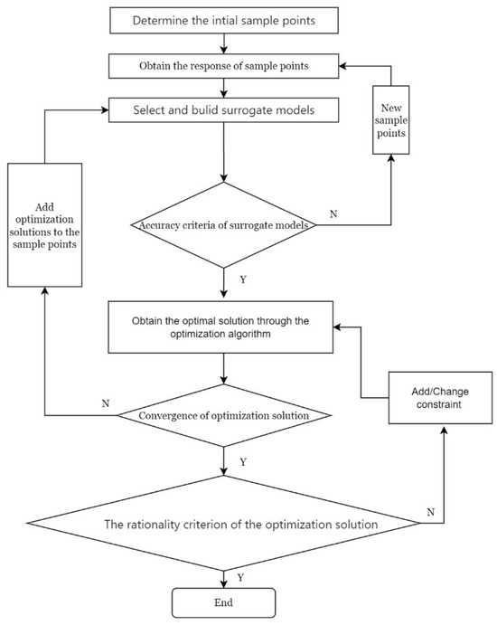 (1) Utilize the orthogonal experimental design method to determine initial sample points systematically. (2) Establish a model and numerically compute the response for each sample point. (3) Based on the initial sample points and their responses, select and construct a surrogate model representing the relationship between aerodynamic parameters and design parameters. (4) Use new responses from external sample points to evaluate the accuracy of the surrogate model, and if the accuracy falls below the required threshold, add the new sample points to the initial sample points and repeat steps 2 to 4. Continue this process until a surrogate model with satisfactory accuracy is obtained. (5) Utilize the surrogate model and optimization algorithm to obtain the optimal solution under given constraints. (6) Compare simulation results with the predictions of the surrogate model to assess convergence. If convergence is not achieved, add the results to the initial sample points and repeat steps 2 to 6 until the desired convergence is reached. (7) Evaluate the reasonability of the optimization results. If deemed unreasonable, add or modify constraints, and repeat steps 5 to 7 until satisfactory optimization results are obtained.