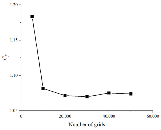 To ensure computational accuracy while optimizing computational resources, a mesh independence study was conducted. Different grids were applied to the same ejector nozzle model, with the thrust coefficient used as a reference. The results for varying grid quantities are depicted in Figure 6. It is observed that after exceeding 20,000 grids, the variations become negligible. Therefore, considering computational efficiency and accuracy, the mesh quantity is maintained around 30,000.