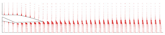 Figure 7 presents the velocity vector field for Case 1. At different axial positions, red arrow sizes indicate velocity magnitude, while directions represent velocity vectors. It can be observed that the secondary flow initially has a slower velocity, creating a significant velocity gradient downstream of the main nozzle outlet in conjunction with the primary flow. The velocity continuously accelerates and becomes relatively constant near the outlet position.