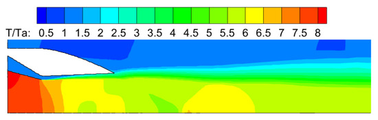 Figure 11 provides the dimensionless temperature contour plot for Case 1, where represents the ratio of local static temperature to ambient atmospheric pressure. It can be seen from the figure that the primary flows out of the main nozzle outlet and expands directly to the wall of the ejector nozzle. The secondary flow all mixes with the primary flow, and the temperature near the wall of the ejector nozzle is slightly lower.