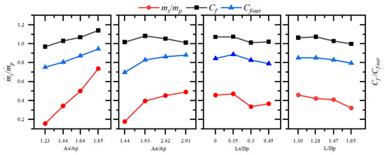 The aerodynamic performance of the studied ejector nozzle in this paper is characterized by three parameters: the ejector flow rate ratio, thrust coefficient, and net thrust coefficient.
