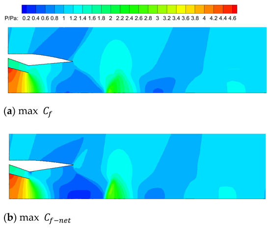 To more intuitively illustrate the impact of variation on the afterbody drag, the pressure distribution on the afterbody surface for the two models is shown in Figure 17. It can be observed that in the max model, the pressure on the afterbody surface decreases more gradually, and the lowest pressure point is closer to the ejector nozzle outlet.
