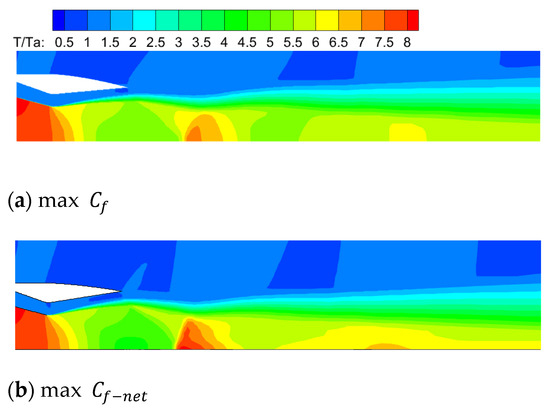 Figure 14, Figure 15 and Figure 16 present the Mach number contour plot, dimensionless pressure contour plot, and dimensionless temperature contour plot for the two optimized models. From the figures, it can be observed that both optimized models are in a state of overexpansion. Due to the larger outlet area of the ejector nozzle in the max model, it exhibits lower pressure near the outlet, resulting in a greater degree of overexpansion. The high-temperature area generated by shock waves at the outlet position is higher and the range is larger. However, this also effectively slows down the acceleration of the external flow in the converging section of the afterbody. In comparison with the pressure contour plot, the low-pressure region near the afterbody in the max model is smaller. This explains why, despite having a lower compared to the max model, the max model still has a higher .