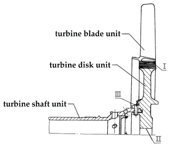Figure 2 shows the connected attribute sets making up units. I is the connection between the turbine disk and turbine blades; II is the connection between the turbine disc and turbine shaft; III is the pin connection between the turbine disc and turbine shaft.