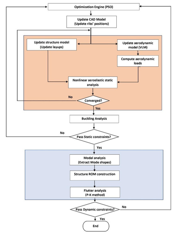 The flowchart presented in Figure 4 provides a comprehensive illustration of the flutter solution and the optimization procedure. Within the optimization flowchart, two primary loops are distinguished: one inner loop, which is designed to satisfy the static structure constraints using optimization, called “Constraint satisfaction using optimization” and an outer loop, which checks the dynamic structural constraints (aeroelastic stability). Following the extraction of the wing’s geometrical configuration from the optimization process, a nonlinear static aeroelastic analysis is executed to calculate significant static deflections, capturing the static equilibrium point upon convergence of the iterative process. For each deformed shape, updated aerodynamic loads based on the deformed structure shape are calculated until convergence is achieved. A post-convergence check is conducted for buckling and static constraints to ensure compliance with optimization constraints. If there is an unsatisfied constraint, the optimizer updates the inputs’ bounds and repeats the loop until all constraints are satisfied. Subsequently, flutter analysis is performed around the static equilibrium point obtained from the nonlinear static aeroelastic analysis, utilizing a reduced-order model. Modal analysis is executed to acquire mode shapes and natural frequencies, and the first few modes are incorporated into the reduced-order model for flutter analysis until convergence is reached. The P-k method is then applied to construct aeroelastic frequency and damping diagrams, providing insights into the flutter speed, frequency, and modes contributing to instability. At this point, if the instability speed is within the accepted range, the optimization loop ends.