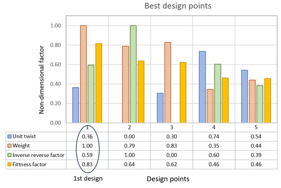 In this methodology, weight coefficients ( C i , i = 1,2 , 3 ) are assigned to each objective, defining their relative significance in the design process. The Fitness Factor, applied in the current study, utilizes a weighting system attributing C 1 = 6 , C 2 = 2   and   C 3 = 1 to wing weight, unit twist factor, and inverse reverse factor, respectively. Assigning the highest weight coefficient to wing weight underscores its paramount importance in optimization. The Fitness Factor quantifies the overall performance of each case study by effectively balancing objectives and their weight coefficients. Optimal design point selection, guided by the highest Fitness Factor, aligns with overarching design objectives while addressing critical failure parameters, particularly the inverse reverse factor. The Fitness Factor is computed for several case studies, ensuring the final wing design aligns with goals and adheres to robust mathematical and engineering principles. The first design point, demonstrating effectiveness with a Fitness Factor of 0.83, is noteworthy (see Figure 7). Comparative analysis reveals the second design’s higher inverse reverse factor, albeit with a lower unit twist factor and reduced weight. Given the study’s multi-objective nature, a thorough examination of all primary design points is imperative, considering their respective Fitness factors.