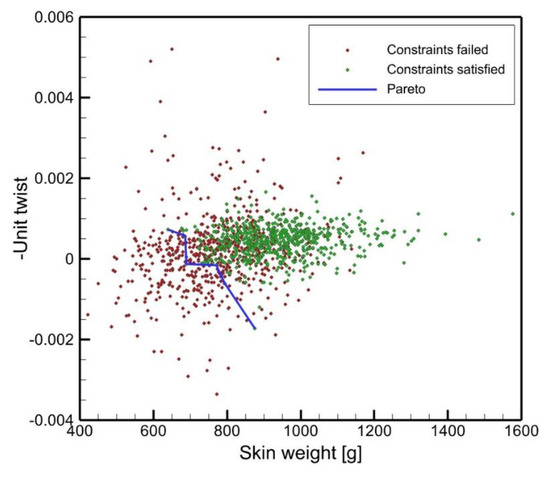 The Pareto curve in the aeroelastic analysis, shown in Figure 8, of a composite wing illustrates the trade-off relationship between wing skin weight and unit twist factor. The horizontal axis denotes variations in skin weight, while the vertical axis represents changes in the unit twist factor. The curve itself, known as the Pareto front, comprises points representing solutions that are Pareto optimal, meaning any improvement in one objective comes at the expense of the other. Regions where constraints are satisfied, constraints are failed, and the Pareto solutions are distinguished. This visual representation makes informed decisions, with design points on the Pareto curve being selected that align with specific priorities, thereby providing a clear understanding of the trade-offs between conflicting objectives in the optimization process.