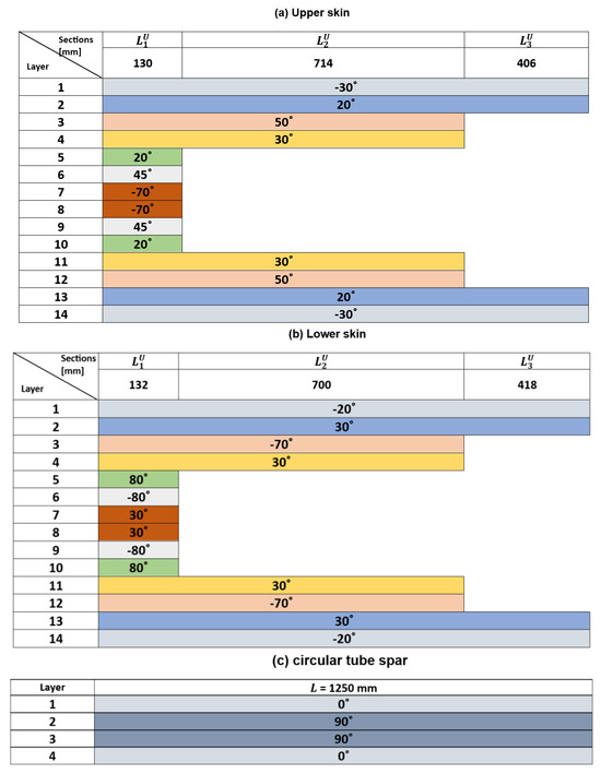 In Figure 9, the stacking sequence in the composite wing configuration is given, revealing the arrangement of the upper and lower skins along with the spar. To enhance design adaptability, the upper and lower skins, strategically incorporated as optimization variables, are subdivided into three distinct regions, each characterized by varying lengths, as visually represented in Figure 6. For tapered upper and lower skins, a unique fiber angle is exhibited by each layer and region, highlighting a distinctive feature. The spar, attributed to its primary role in bearing aerodynamic loads, maintains a consistent fiber angle across its entire span. Emphasizing the symmetric layout inherent in the stacking sequence of both the skins and the spar, this symmetry plays a crucial role in ensuring overall structural integrity and balance in the design. These region lengths and their corresponding outcomes are presented in Figure 9.