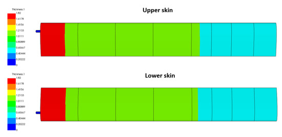 By forming a total of seven distinct laminates by dividing the upper and lower skins into three spanwise laminates and the spar into a single laminate, flexibility is provided in terms of being either unbalanced or symmetric. The optimization procedure meticulously targets specific laminates within the upper and lower skins, as well as the spar, while assigning predetermined laminates to the ribs. The primary objective is to design the wing in accordance with the specified optimization parameters (objectives, variables, constraints, and load cases) and boundaries detailed in Table 4.