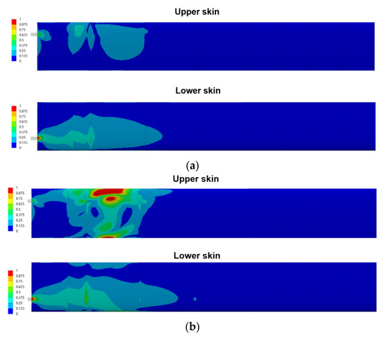 On the other hand, the assessment of the composite wing’s strength involves applying the Tsai-Wu failure principle [59], deriving the in-plane stress state through elastic FEA, and determining strength ratios using in-plane stress components. Investigating out-of-plane failure additionally involves capturing delamination occurrences with a quadratic stress criterion [11,59] and establishing surface-based cohesive behavior between adjacent layers.